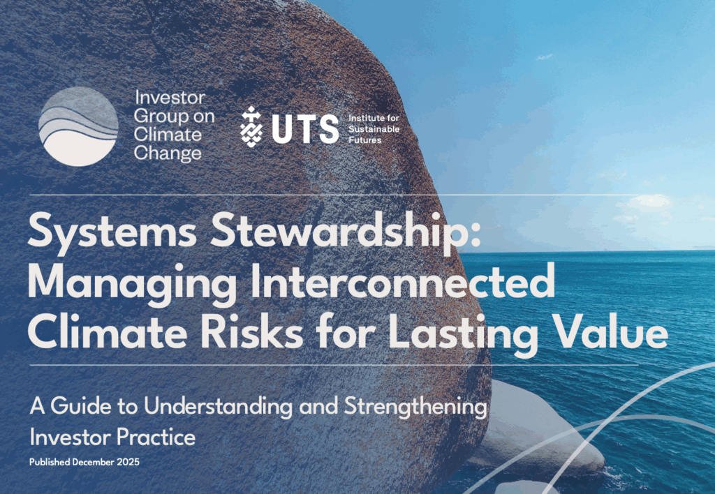 The report, Systems Stewardship: Managing Interconnected Climate Risks for Lasting Value, developed with the Institute for Sustainable Futures (UTS), reveals that addressing climate-related risks requires interconnected action across entire markets, sectors and economies — from grid constraints and supply-chain pressures to technology bottlenecks and policy uncertainty.